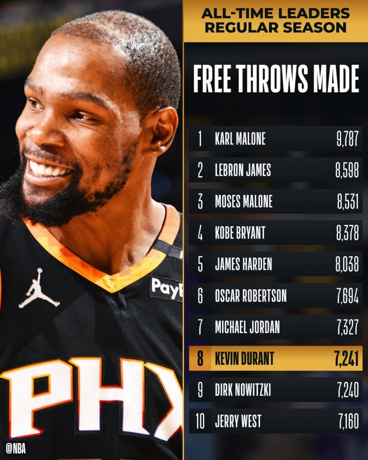 ?KD常規(guī)賽罰球命中數(shù)達(dá)到7241次 超越諾維茨基升至歷史第8!