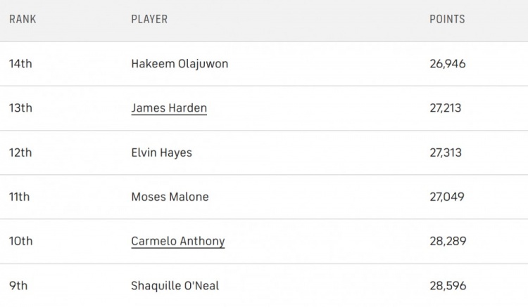 這是一個(gè)總得分非常接近的群體,而且這些球員都已退役,因此我們不需要擔(dān)心積分差距發(fā)生變化。庫(kù)里需要再得到1694分才能超越奧斯卡-羅伯特森并進(jìn)入前15名。這同樣是一個(gè)幾乎確定能達(dá)成的目標(biāo),甚至有可能在下賽季就實(shí)現(xiàn),只要庫(kù)里沒(méi)有長(zhǎng)時(shí)間缺席。本賽季庫(kù)里的場(chǎng)均得分是威少的兩倍,即使威少目前總得分更高,庫(kù)里也有很大機(jī)會(huì)先于他超越羅伯特森。