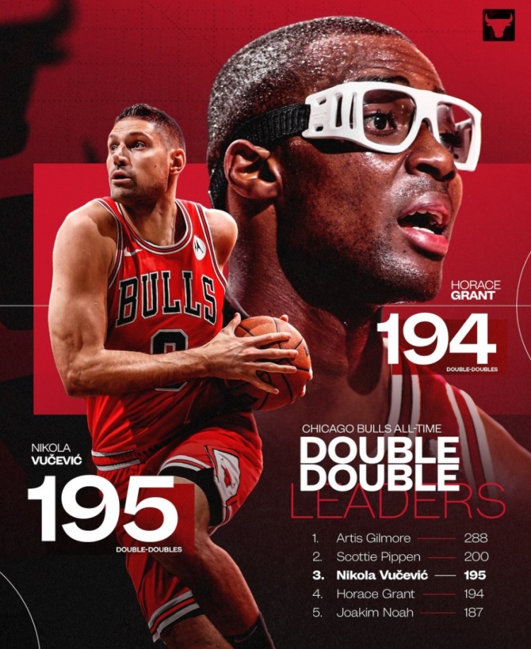 武切維奇公牛兩雙數(shù)超越”眼鏡蛇“格蘭特 上升至隊史第三位