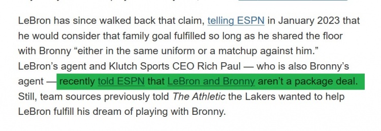 2022年2月,詹姆斯在接受The Athletic采訪時第一次談到父子同臺的愿望:“我在生涯最后一年會和我兒子一起打球,無論布朗尼在哪里,我都會去那個地方。我愿意做任何事情來實現(xiàn)與我的兒子一起打球一年。屆時錢也就不重要了?!?/p>