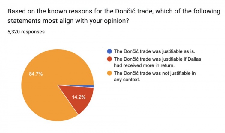 參與問(wèn)卷調(diào)查的5320名球迷中,84.7%的球迷認(rèn)為東契奇交易在任何情況下都說(shuō)不過(guò)去,14.2%的球迷認(rèn)為如果獨(dú)行俠獲得更多的回報(bào),那么東契奇交易說(shuō)得過(guò)去,認(rèn)為東契奇交易說(shuō)得過(guò)去的球迷只占1.1%。