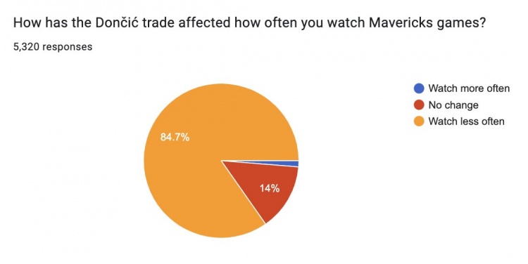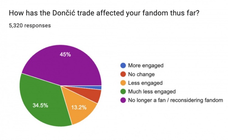 在東契奇交易如何影響你對(duì)球隊(duì)的喜愛(ài)這個(gè)問(wèn)題上?45%的球迷表示不再是一名球迷或者要重新考慮自己的喜愛(ài)程度;34.5%表示自己現(xiàn)在參與度低多了,13.2%的球迷表示自己參與度略有降低,只有7.3%的球迷表示自己的喜愛(ài)度沒(méi)有變化或者參與度更高了。