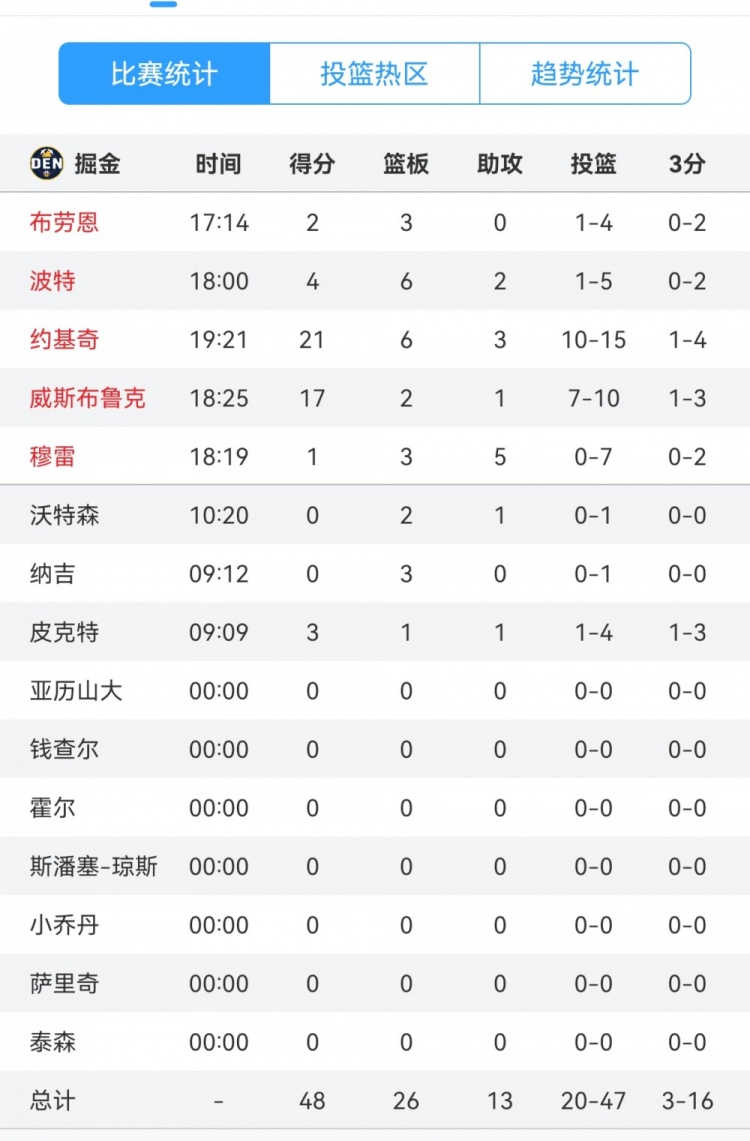 上半場,掘金除約基奇和威少外均表現(xiàn)不佳,全隊半場47投20中,約基奇和威少25投17中,其他人合計22投僅3中,其中賈馬爾-穆雷個人7投0中。