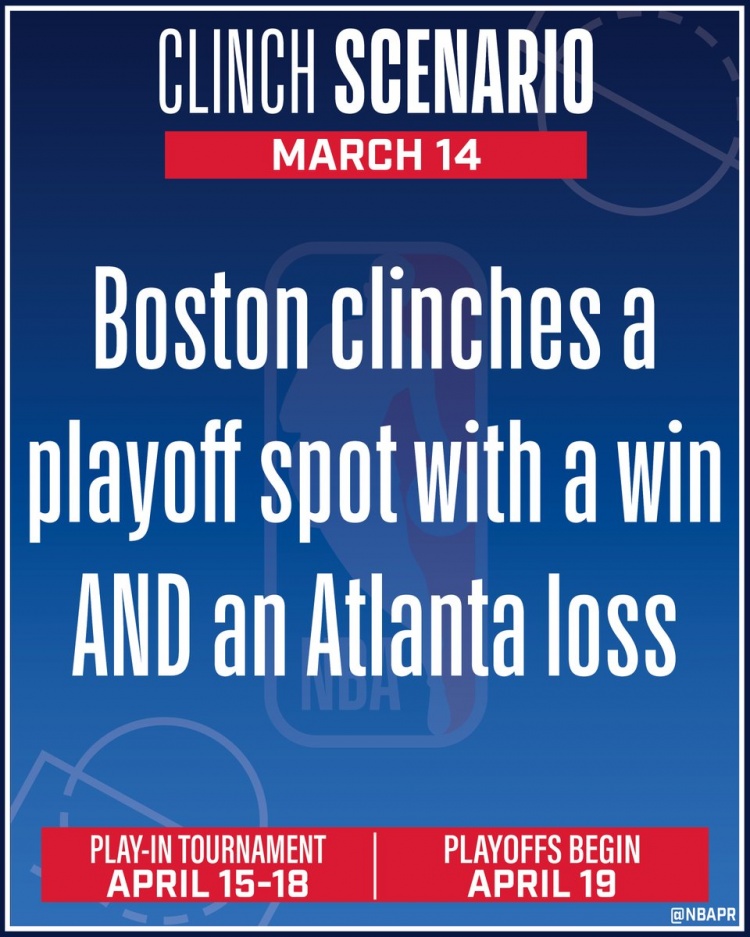 綠軍明天有可能鎖定季后賽席位,如果他們擊敗熱火,同時老鷹輸球(老鷹明天早上7點30分主場迎戰(zhàn)快船),他們將提前拿到季后賽門票。