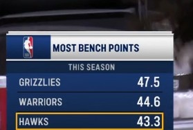 本賽季替補(bǔ)得分前3球隊(duì):灰熊47.5分第1 勇士44.6第2 老鷹43.3第3
