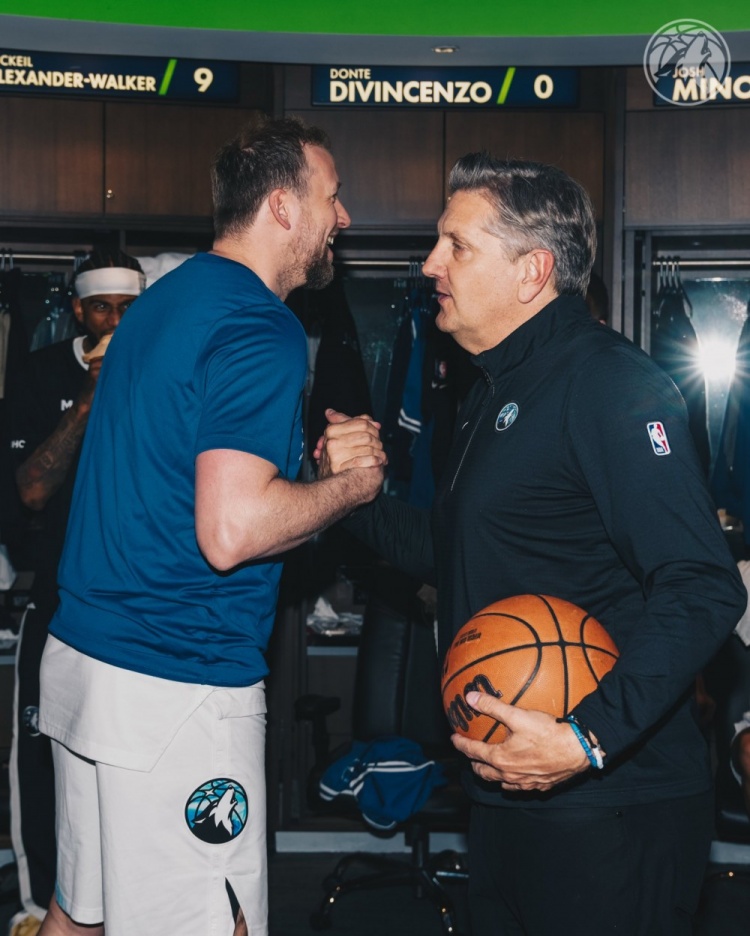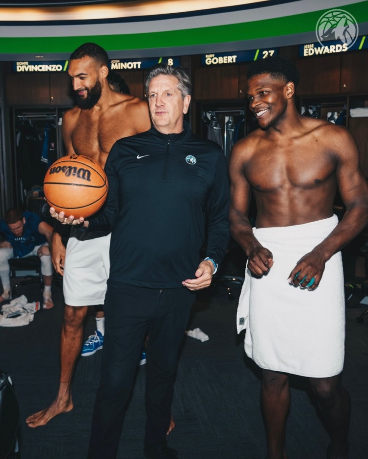森林狼更衣室祝賀芬奇200勝:拿到比賽用球 華子戈貝爾裹浴巾合影