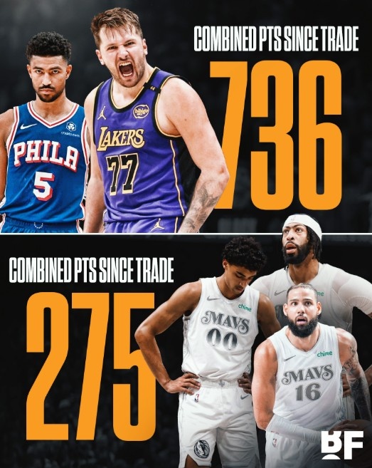 交易后東契奇在湖人拿到393分,格萊姆斯在76人拿到364分