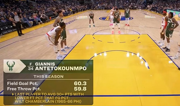 比賽中轉播方給出一組數(shù)據(jù),字母哥本賽季投籃命中率60.3%,罰球命中率59.8%。