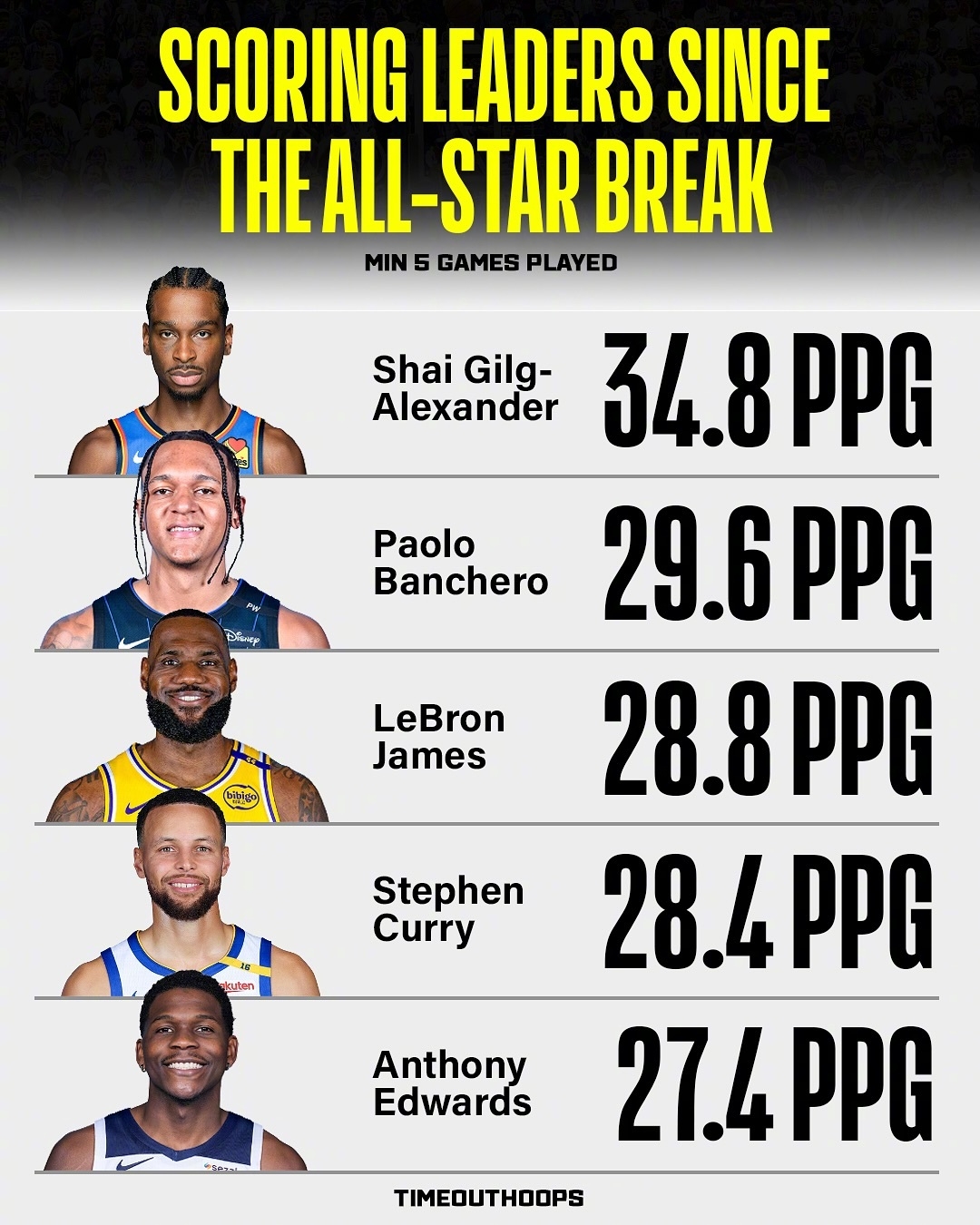 全明星后得分榜:鴨梨34.8分?jǐn)鄼n第一 班凱羅第二 詹庫分列三四位