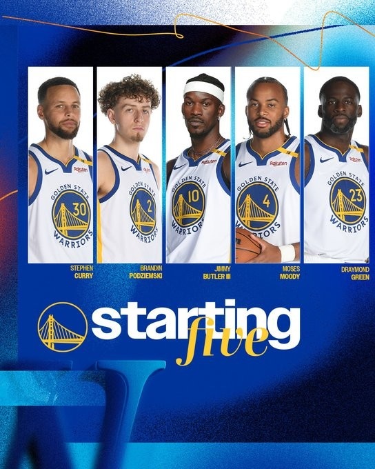 勇士官方賽前公布了本場比賽首發(fā)陣容:庫里、波杰姆斯基、巴特勒、穆迪、追夢。