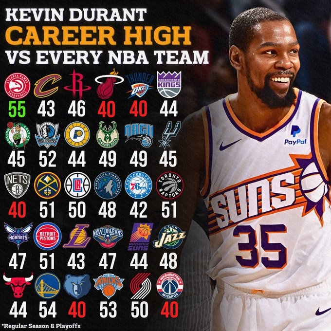死神面前眾生平等??杜蘭特生涯戰(zhàn)各隊單場最高分 40打底 最高55