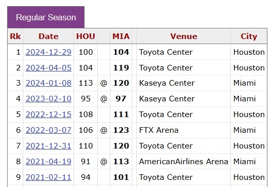 這樣一來(lái),火箭結(jié)束了自己對(duì)熱火的常規(guī)賽9連敗,具體如下: