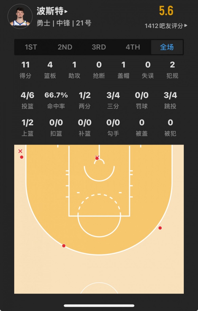 勇士52號(hào)秀 昆滕-波斯特 登場(chǎng)27.5分鐘