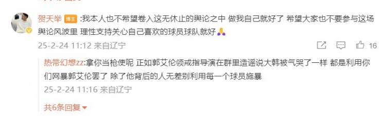 之后,賀天舉還在這條動態(tài)的評論區(qū)寫道:“我本人也不希望卷入這無休止的輿論之中 做我自己就好了 希望大家也不要參與這場輿論風波里 理性支持關(guān)心自己喜歡的球員球隊就好????”