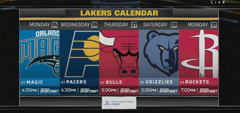 準(zhǔn)備開(kāi)啟東征!湖人未來(lái)5場(chǎng)對(duì)手:魔術(shù)/步行者/公牛/灰熊/火箭