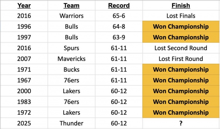 另外,雷霆是歷史上就11支在賽季前72場拿到60+勝的球隊(duì),此前10支球隊(duì)有7支最終奪冠。