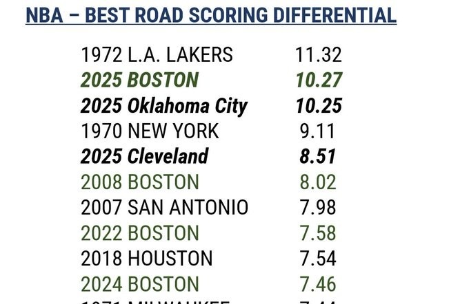 據(jù)統(tǒng)計,本場比賽過后,凱爾特人的賽季場均客場凈勝分來到10.27,超越本賽季的雷霆(10.25),升至歷史第二位,僅次于1972年的湖人。