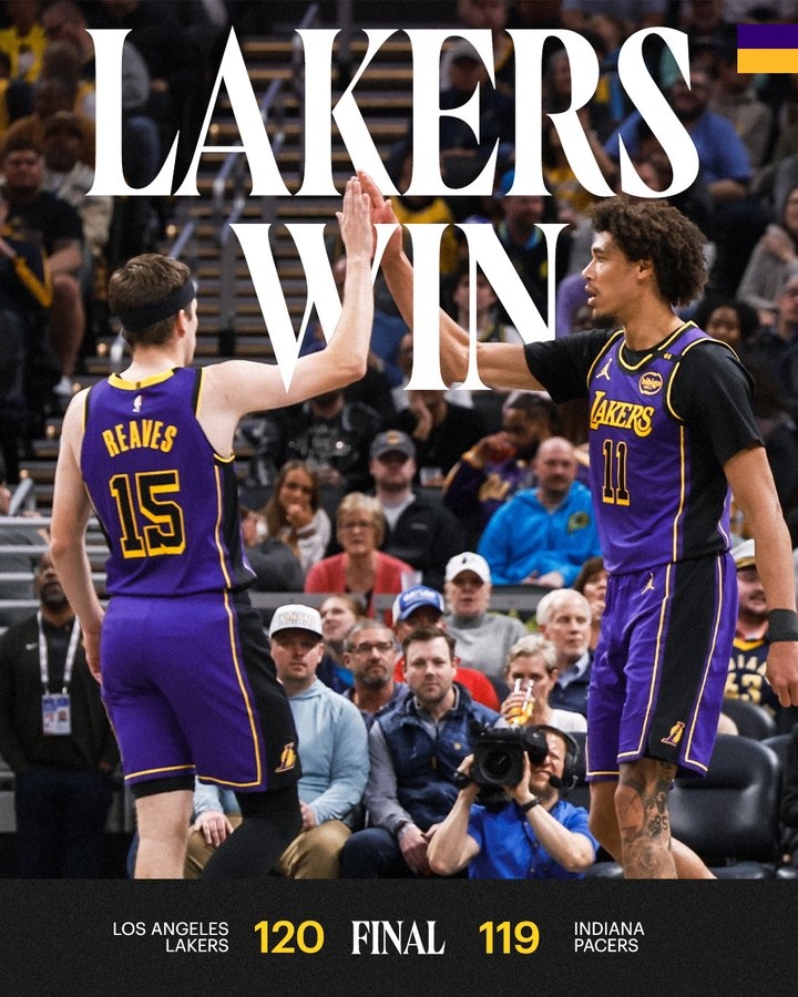 賽后湖人官方曬出贏球海報(bào),里夫斯和海斯擊掌的畫面登上封面。