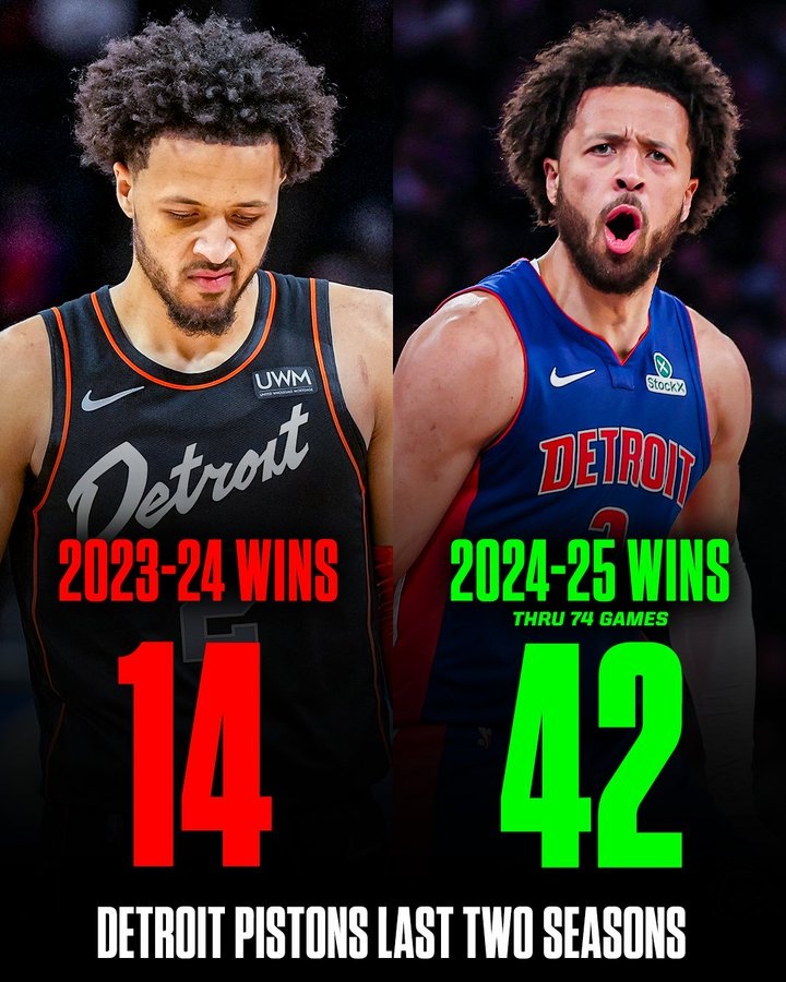 據(jù)統(tǒng)計,活塞上賽季只有14勝,本賽季至今已經(jīng)42勝。他們也成為NBA歷史上第一支贏球場數(shù)是上賽季3倍的球隊(duì)!