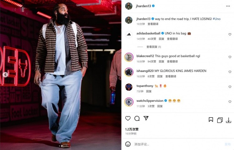 賽后哈登更新INS曬照并寫道:“結(jié)束客場之旅的正確方式,我討厭輸球!”