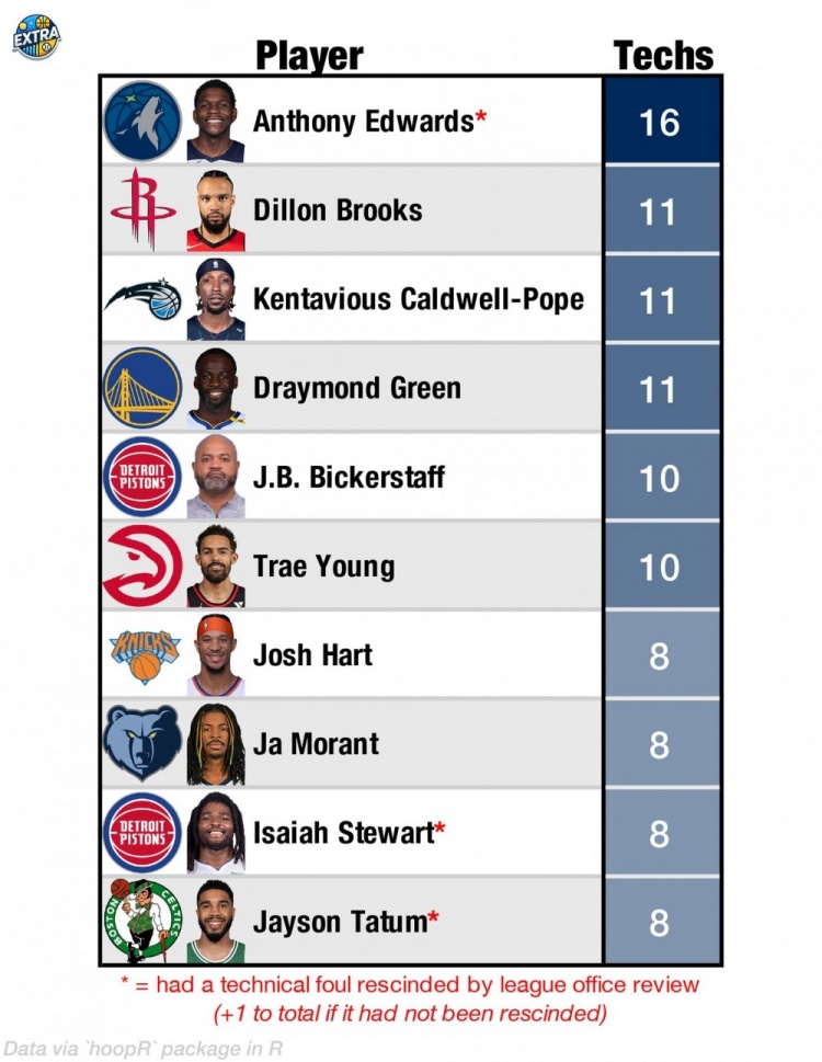 華子16次遭停賽!本賽季技犯榜:狄龍&追夢11次第二 活塞主帥10次