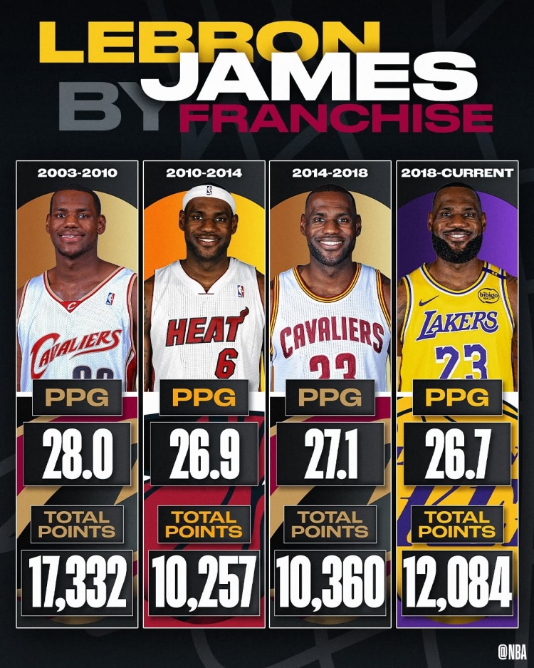 詹姆斯生涯四個(gè)階段總得分均破萬(wàn) 各階段場(chǎng)均得分差距不大