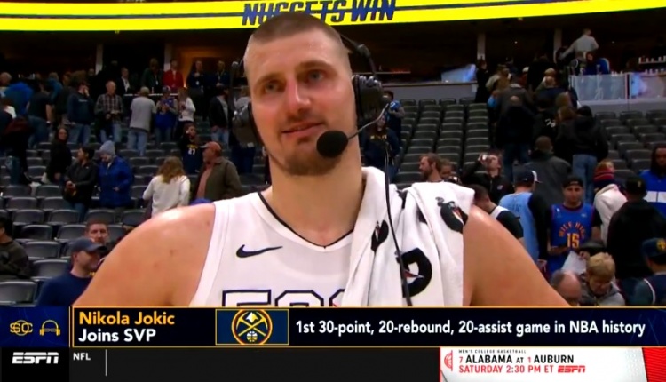 約基奇斬獲生涯第42場30+三雙 追平詹姆斯 并列歷史第4