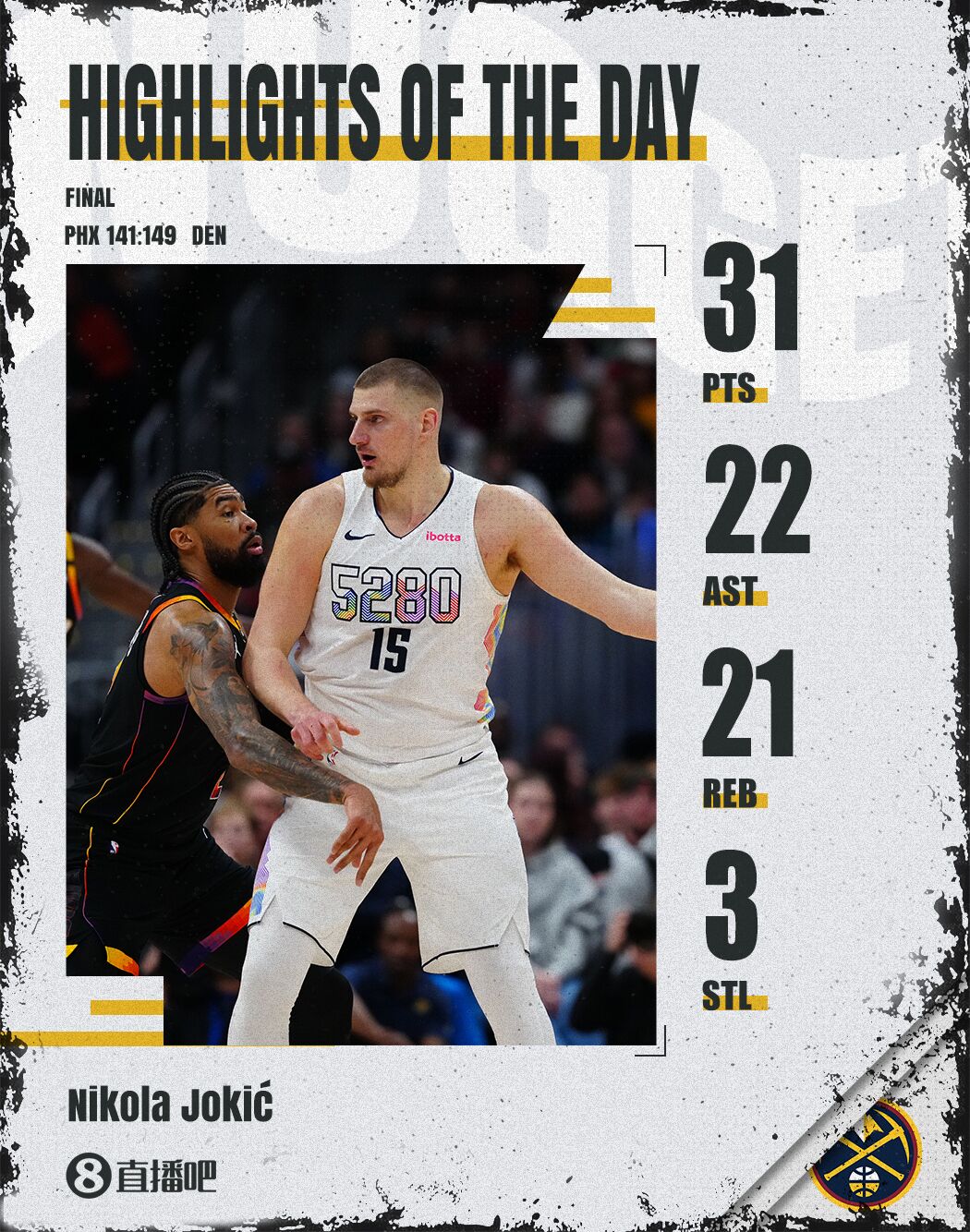 約基奇爆砍31分21板22助!威少INS再次轉(zhuǎn)發(fā):MVP