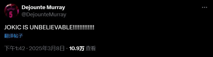 賽后,鵜鶘后衛(wèi)德章泰-穆雷更推寫道:約基奇實在太不可思議了!