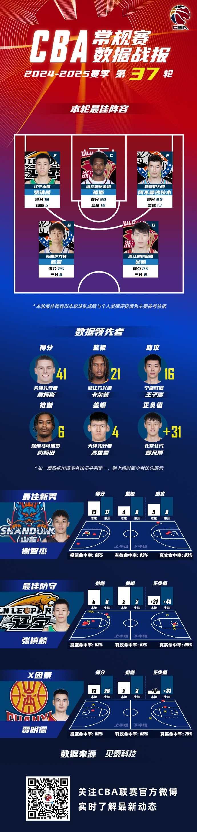 2024-2025賽季CBA聯賽常規(guī)賽第37輪結束較量,來自遼寧沈陽三生飛豹籃球俱樂部的張鎮(zhèn)麟 ,浙江稠州籃球俱樂的瓊斯和吳前 ,新疆廣匯籃球俱樂部的阿不都沙拉木和趙睿入選CBA聯賽常規(guī)賽第37輪最佳陣容!