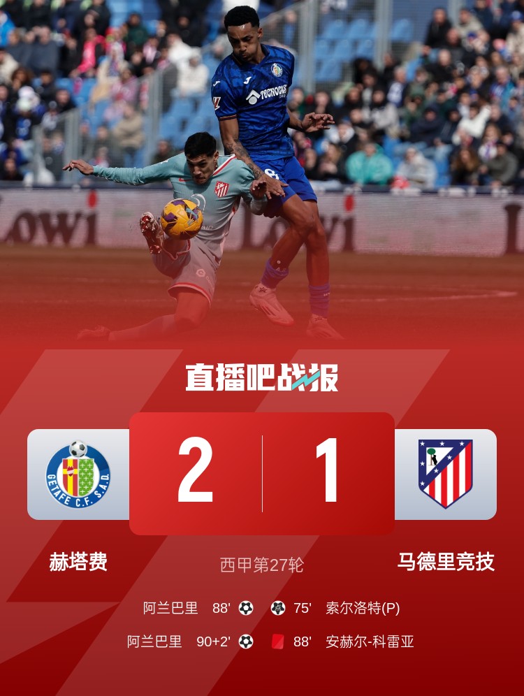 馬競1-2不敵赫塔費,科雷亞第88分鐘染紅,馬競錯失登頂機會!