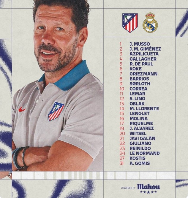 中場:4-加拉格爾、5-德保羅、6-科克、7-格列茲曼、8-巴里奧斯、11-勒馬爾、12-利諾、14-馬科斯-略倫特、20-維特塞爾、