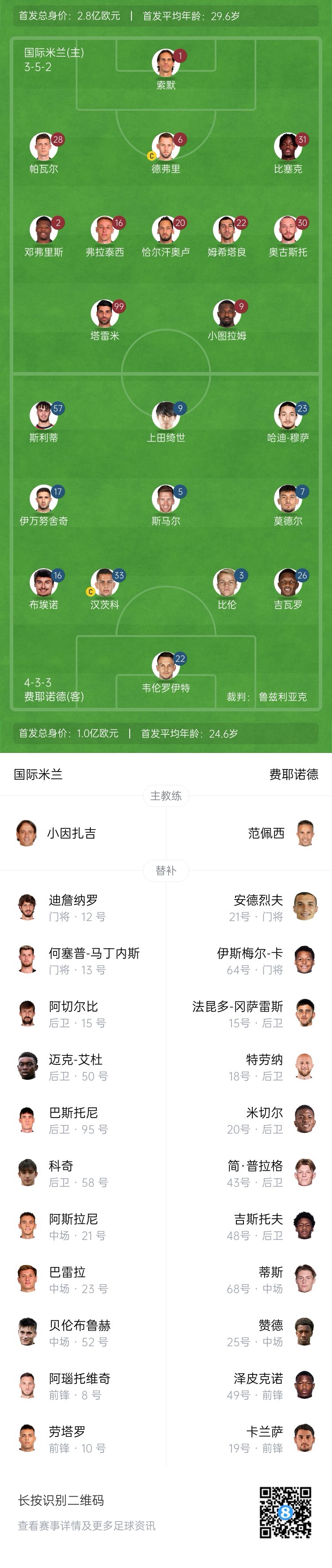 3月12日訊 歐冠16強(qiáng)次回合,國米主場(chǎng)迎戰(zhàn)費(fèi)耶諾德比賽即將打響。賽前首發(fā)出爐。