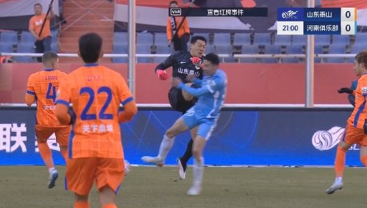 比賽第23分鐘,河南隊(duì)長傳,王大雷沖出禁區(qū)解圍沒踢到球,踢翻了劉鑫瑜,主裁一開始出示黃牌,隨后去場邊查看VAR,取消黃牌,將王大雷直紅罰下!