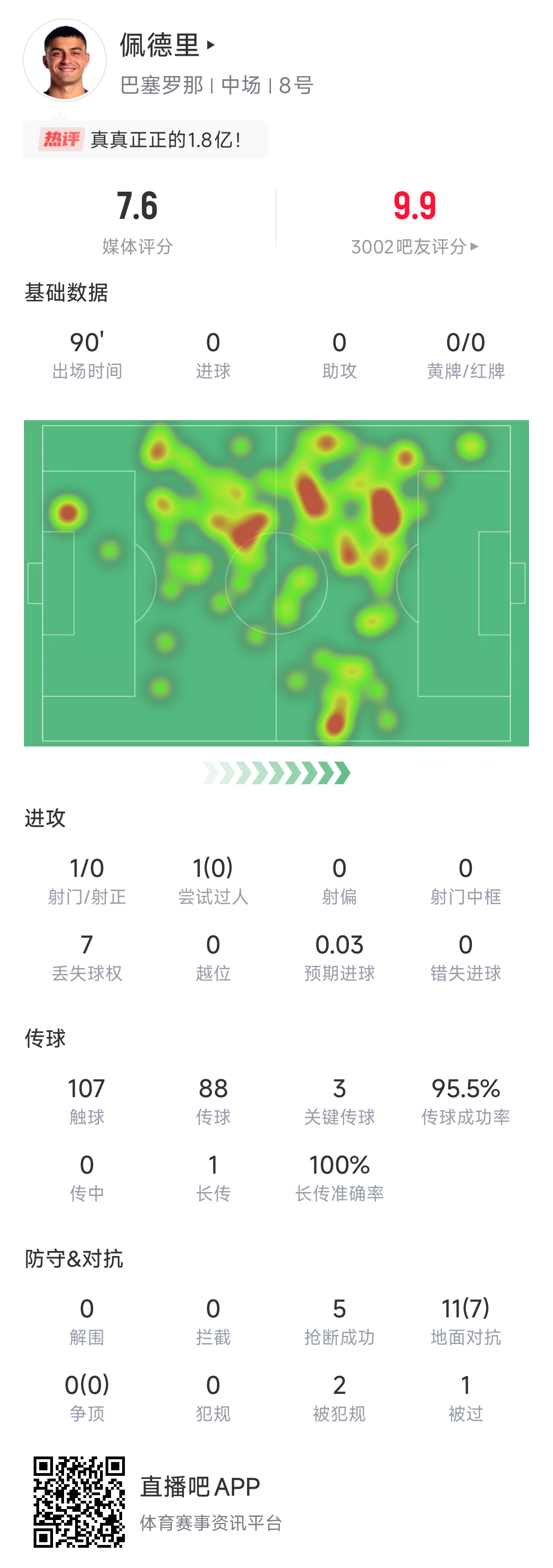 佩德里本賽季幾乎全勤,只缺席巴薩一場(chǎng)比賽,他在41場(chǎng)比賽里貢獻(xiàn)5球6助。不過進(jìn)球數(shù)據(jù)并不能體現(xiàn)出佩德里的表現(xiàn)。例如他在本場(chǎng)比賽首發(fā)出戰(zhàn),貢獻(xiàn)3次關(guān)鍵傳球,觸球107次僅有7次丟失球權(quán),傳球成功率達(dá)到95.5%,另外他還有5次搶斷以及7次地面對(duì)抗成功。