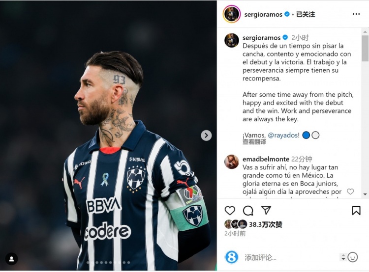 拉莫斯社媒:很高興上演蒙特雷首秀,努力和堅持總會有回報