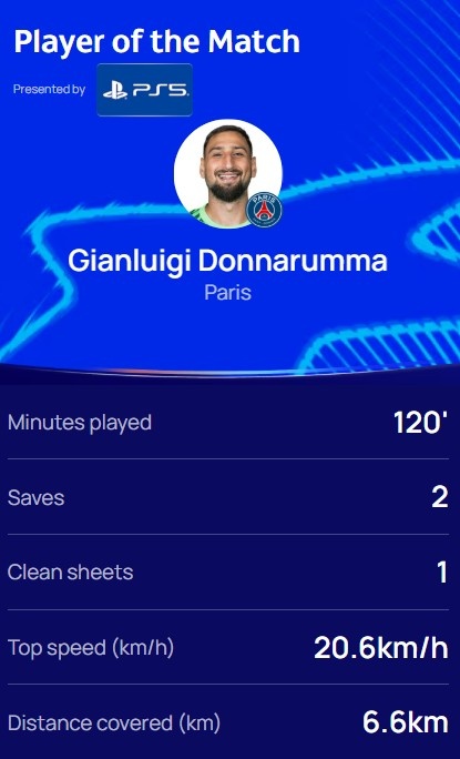 本場(chǎng)比賽巴黎門將多納魯馬發(fā)揮出色,在120分鐘時(shí)間做出2次撲救,并且在點(diǎn)球大戰(zhàn)中兩次撲出對(duì)手點(diǎn)球。