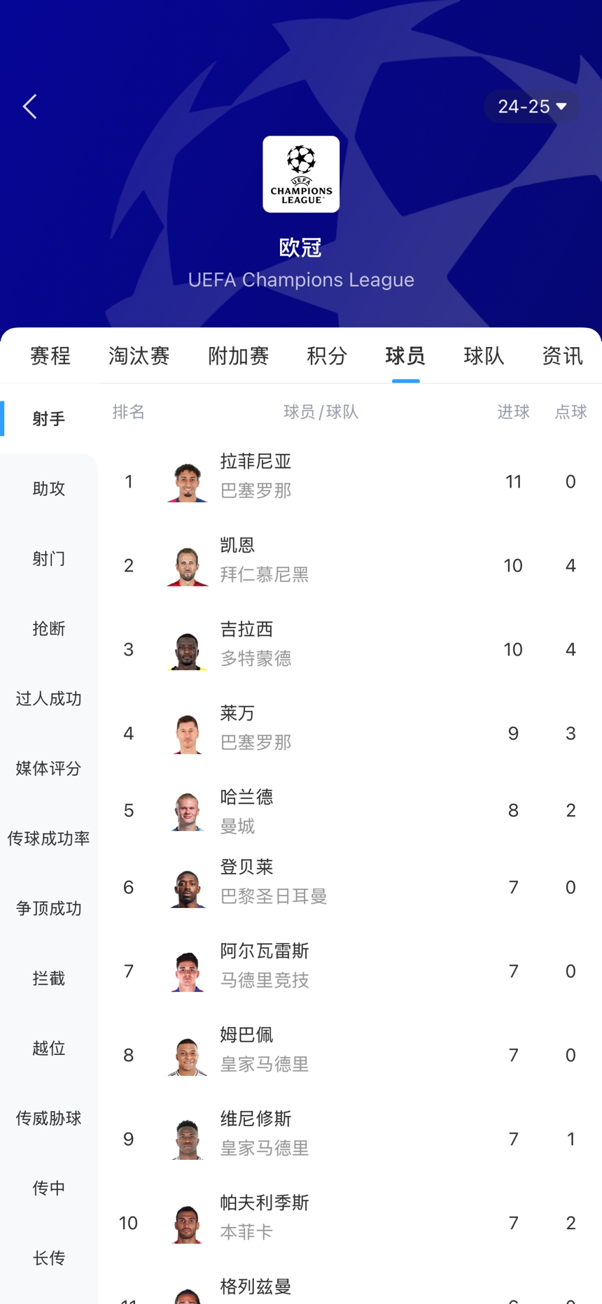 本賽季歐冠,拉菲尼亞出戰(zhàn)10場貢獻(xiàn)11球5助攻。