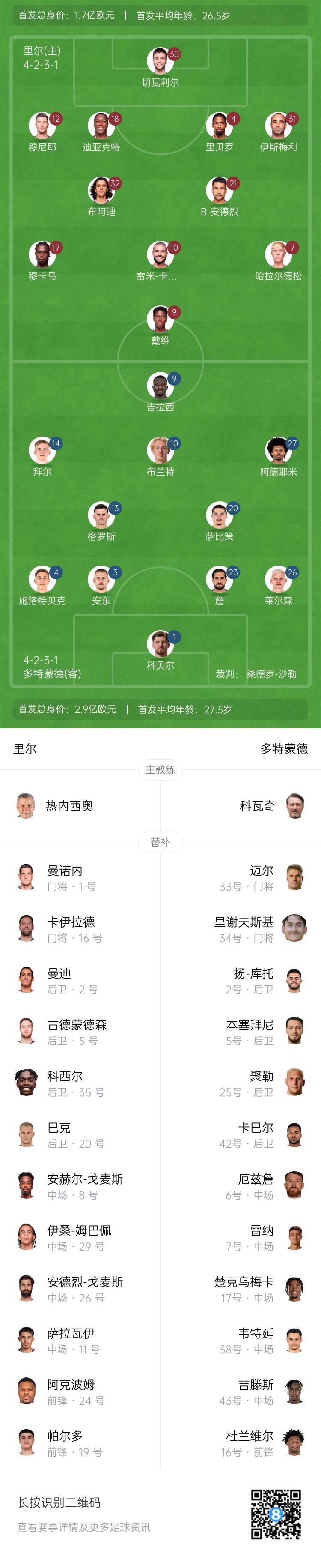里爾替補(bǔ):1-曼諾內(nèi)、16-卡伊拉德、2-曼迪、5-古德蒙德松、35-科西爾、20-巴克、8-安赫爾-戈麥斯、29-伊桑-姆巴佩、26-安德烈-戈麥斯、11-薩拉瓦伊、24-阿克波姆、19-帕爾多
