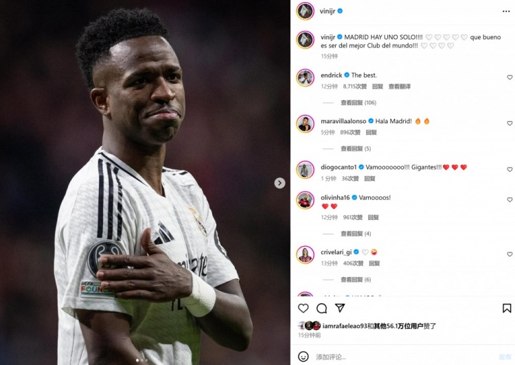 本場比賽維尼修斯罰丟一粒點球,賽后他在社媒曬照慶祝勝利,配文寫道:“馬德里只有唯一,能成為世界最佳俱樂部的一員是多棒的事情!”