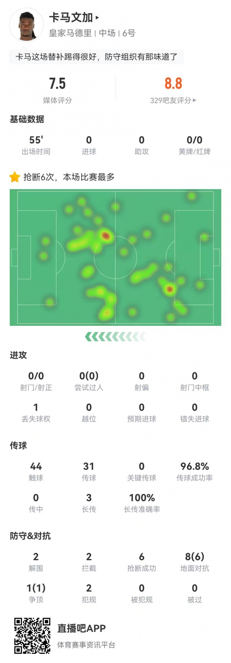 卡馬文加替補9對抗7成功+6搶斷2解圍2攔截 3長傳3成功 獲7.5分