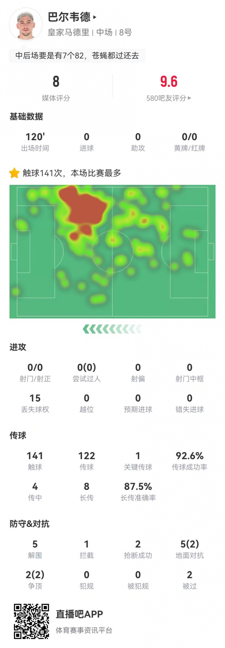 巴爾韋德本場(chǎng)5解圍2搶斷2被過 8長傳7成功+1點(diǎn)球大戰(zhàn)進(jìn)球 獲8.0分