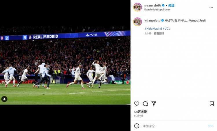 今日,安切洛蒂在社媒曬出賽后球員們狂奔慶祝的照片,寫道:直到最后……加油,皇馬!