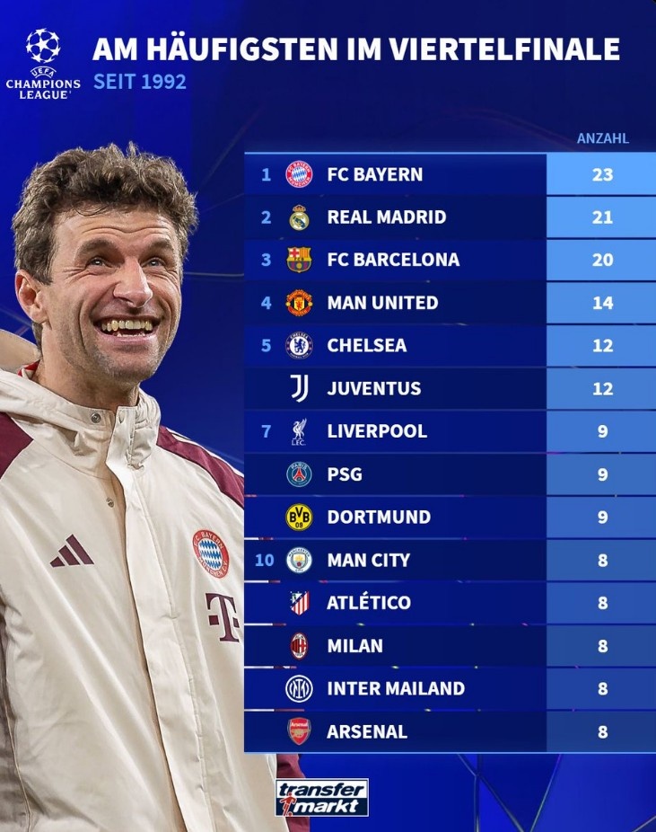 歐冠改制以來(lái)進(jìn)入8強(qiáng)次數(shù)榜:拜仁23次居首,皇馬次席,巴薩第三