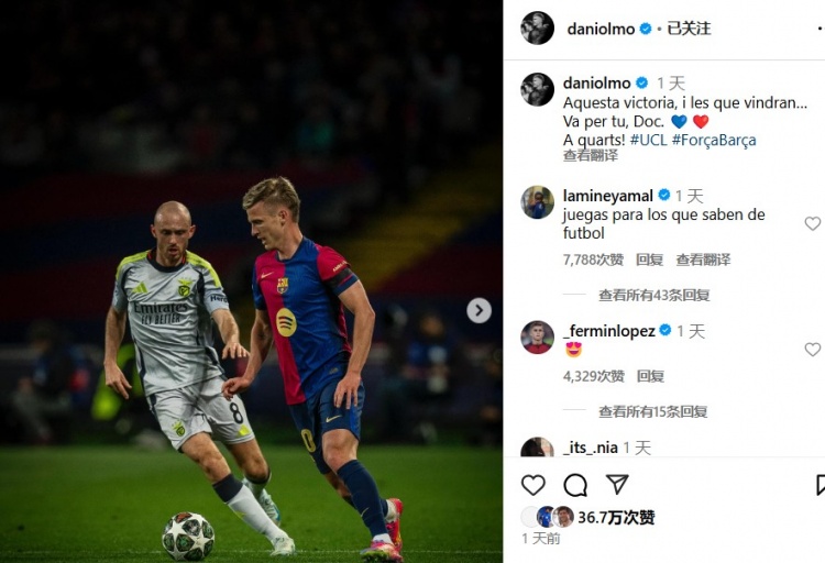 在賽后,奧爾莫更新社媒表示道:“這場勝利,以及那些即將到來的勝利,都獻(xiàn)給你,醫(yī)生??????。晉級(jí)歐冠八強(qiáng)!”(巴薩上周末西甲比賽前,一位隊(duì)醫(yī)意外離世)