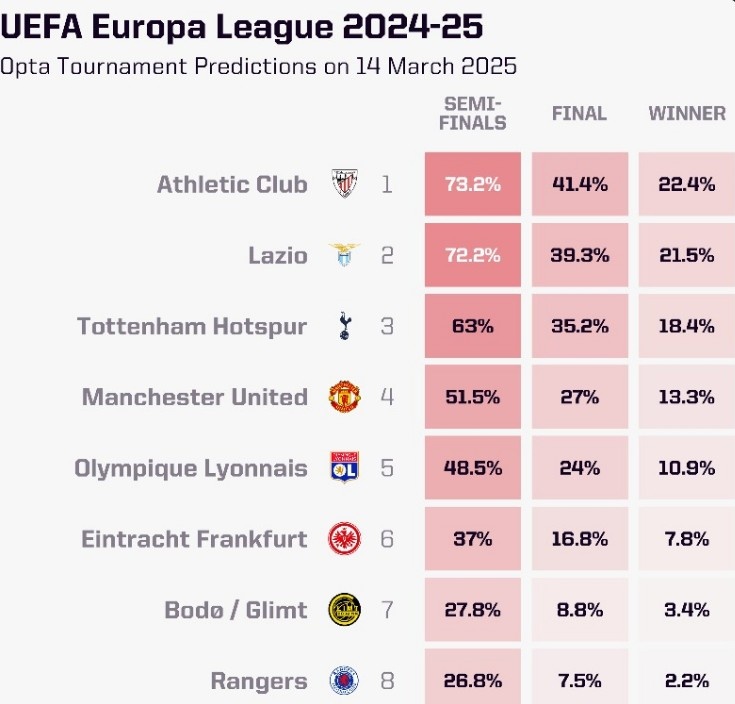 3月14日訊 本賽季歐聯(lián)杯8強(qiáng)產(chǎn)生,數(shù)據(jù)網(wǎng)站OPTA也對(duì)本賽季歐聯(lián)杯奪冠概率進(jìn)行了預(yù)測(cè),其中畢爾巴鄂競(jìng)技最被看好,曼聯(lián)第四。具體如下(三項(xiàng)數(shù)據(jù)依次是晉級(jí)半決賽概率、晉級(jí)決賽概率、奪冠概率):