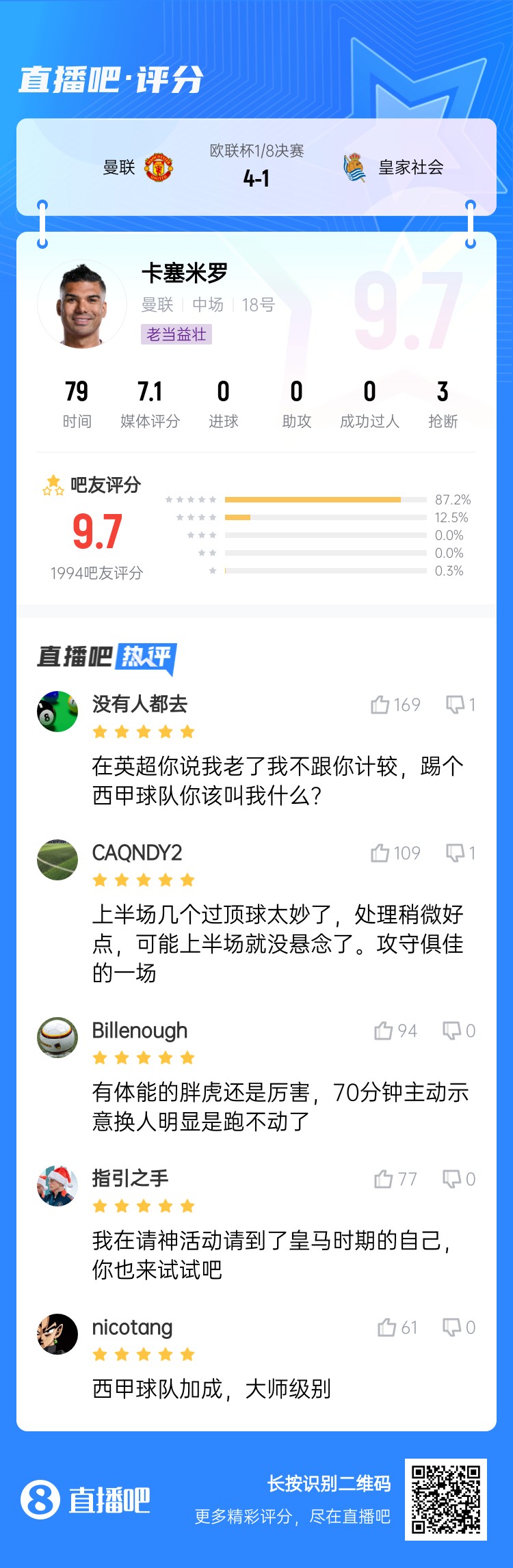 歐聯(lián)1/8決賽次回合,曼聯(lián)4-1戰(zhàn)勝皇家社會??ㄈ琢_本場比賽首發(fā)出戰(zhàn)79分鐘,表現(xiàn)出色,賽后吧友給他打出9.7分的高分。