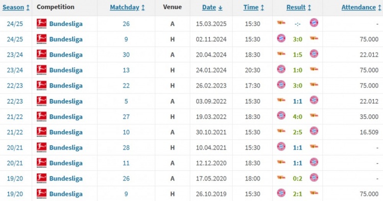 據(jù)德轉(zhuǎn)數(shù)據(jù)統(tǒng)計,兩支球隊歷史上曾11次交手(均是德甲比賽),拜仁8勝3平未嘗敗績,共計打進28球丟7球。