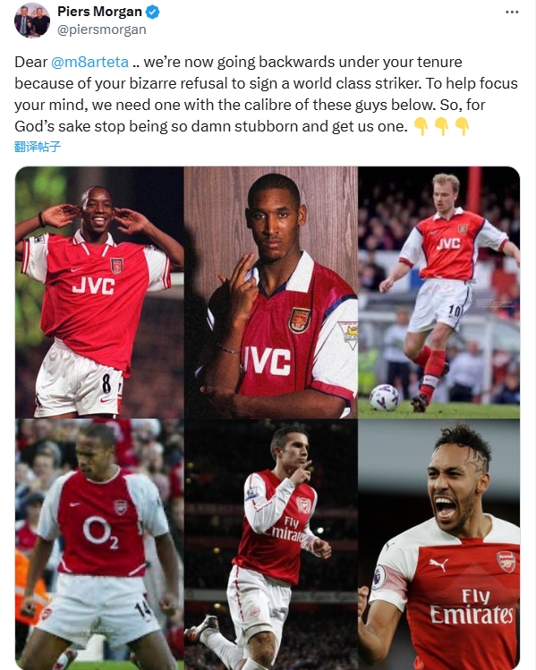摩根曬亨利、博格坎普等人照片寫(xiě)到:“親愛(ài)的阿爾特塔,我們?cè)谀愕膱?zhí)教下正在倒退,因?yàn)槟隳鼐芙^簽下一位世界級(jí)前鋒。為了幫助你專注,我們需要一個(gè)有下面這些人能力的球員。因此,看在上帝的份上,別這么固執(zhí),給我們找一個(gè)吧?!?/p>