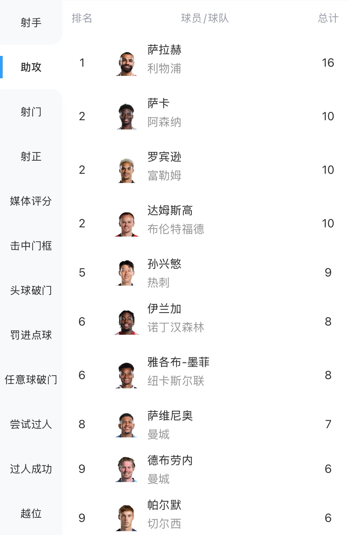 英超助攻榜: